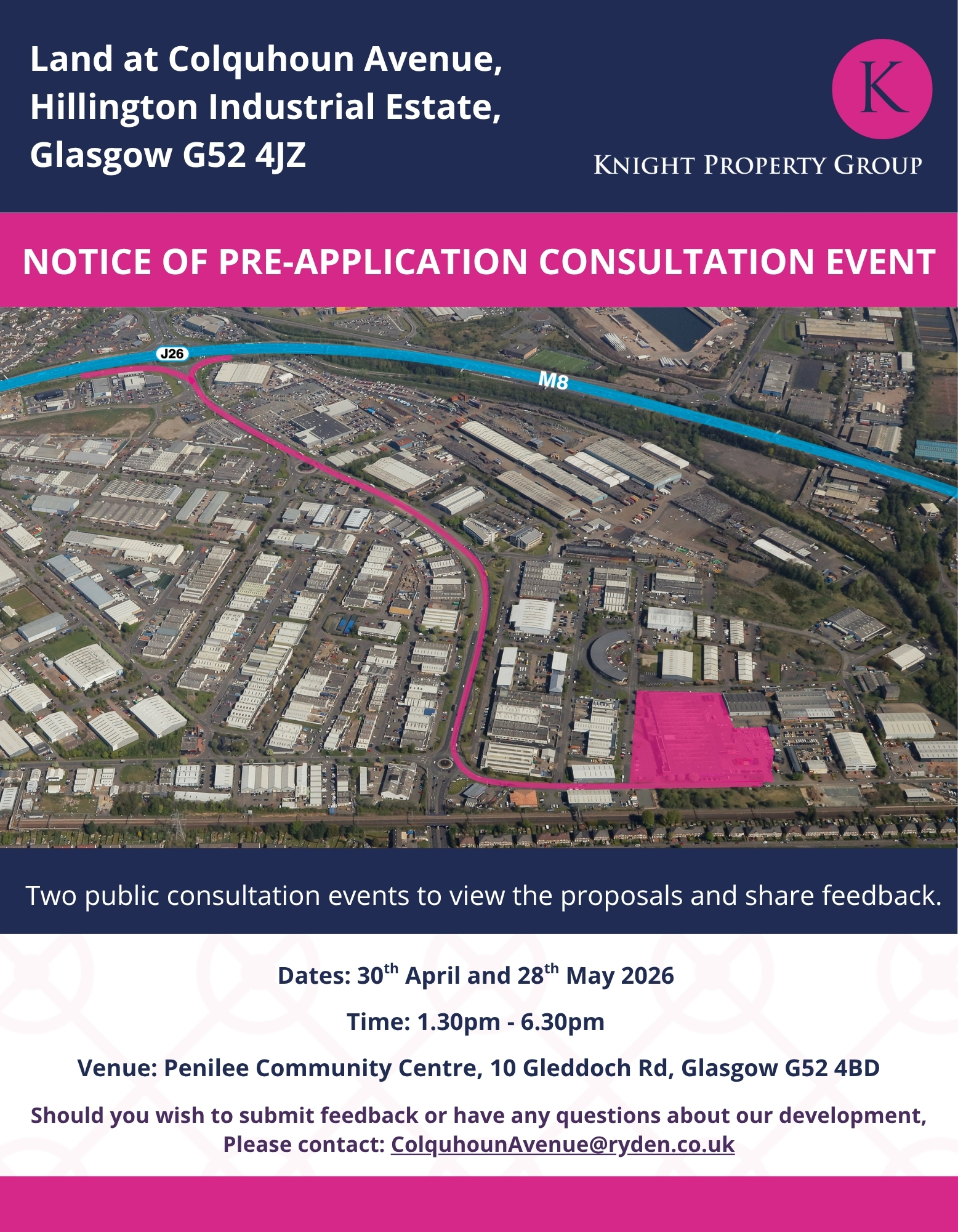 Knight Property Group has submitted a Proposal of Application Notice (PAN) to Glasgow City Council, marking the first formal stage in the planning process for a proposed industrial development at Hillington Industrial Estate.